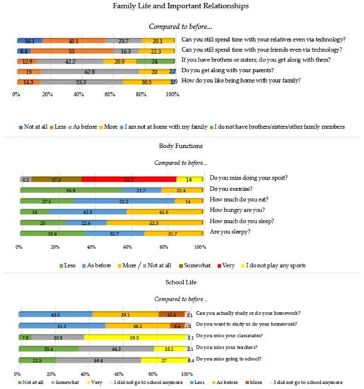 Figure 1 shows the overall responses to the questions related to family life, important relationships, body functions, and school life among children, pre-adolescents, and adolescents. Responses related to the pleasure of being at home with parents and siblings during the quarantine show an even and comparable frequency distribution, whereas a higher percentage of the sample reported more pleasure related to staying at home with their family. In contrast, the overall sample reported reduced contact, even via technology, with friends, as well as with relatives (i.e., uncles, aunts, cousins, grandfathers, grandmothers, etc.) outside their immediate family nucleus compared to before the quarantine. As regards body functions, such as sleeping, sleepiness, hunger, food consumption, and lack of sport practices, compared to before the quarantine period, the majority missed their sport activities, reporting less exercise than before the quarantine. Most of the sample (975, 93.1%) attended school lessons using technological devices; the frequency distribution related to the pleasure of attending school using technology is spread across the various response options. Additionally, when it comes to the question regarding whether they miss going to school or their teachers, the frequency distribution is evenly spread across all response items; the sole exception was the question related to their classmates, for which the entire sample reported missing them very much. Finally, the overall sample reported being less inclined to study and less able to effectively do their homework compared to pre-quarantine.
