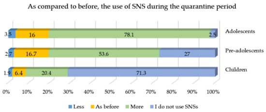 As shown in Figure 2, the frequency of SNS use was higher during the lockdown period, with adolescents as the most prolific users of SNSs, followed by pre-adolescents and children.