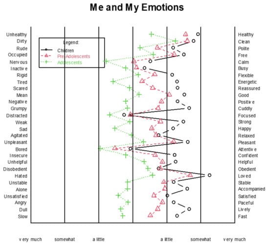 The trend of emotions reported by children (n = 265), pre-adolescents (n = 293), and adolescents (n = 489) during the quarantine period.