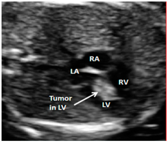 An intracardiac tumor attached to the ventricular septum as observed on four chamber view—LA, left atrium; RA, right atrium; LV, left ventricle; RV, right ventricle.