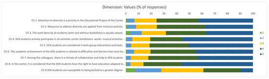 - Inclusive values. Values guide and are the foundation of our actions. They are what give meaning and purpose to our efforts. Values affect the content of what we teach, how we teach, and how we relate to students and their families. In this sense, the items associated with this category aim to check the presence or absence of inclusive values in schools, such as equality, respect for differences, and non-discrimination. We asked the teachers if the criteria and indicators they used were consistent with inclusive principles to establish the center’s access, the formation of groups, the organization of support for SEN, and the methodology of curricular and complementary activities.