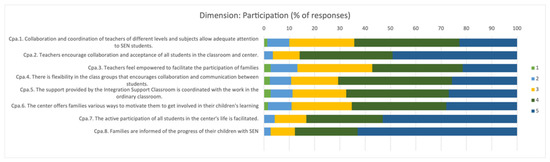 Concerning the degree of participation in the educational community, the average values of the items decrease (Mdn, 69.1). However, most of the teachers’ perception (87.8%) is that families are informed of their children’s progress with SEN (Cpa.8). On the other hand, when we asked if teachers feel empowered to facilitate the participation of families (Cpa.3), the results indicate the need for specific training, which reinforces the skills and strategies of teachers. Only slightly more than half (57.2%) felt they were trained, and the majority did not know how to deal with these situations. This request for training is a common demand among the professionals in the education, and not only in the compulsory stage [41].