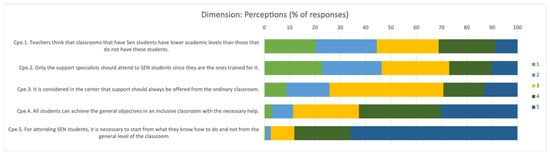 Regarding the category related to “teachers’ perceptions of the educational response that should be offered to SEN students”, the data provided contradictions with the results obtained as an average in the values dimension (Figure 3). This circumstance could indicate that individual differences are not perceived as a factor of enrichment, expressing concern about a possible decrease in the academic level of the rest of the students due to the classroom heterogeneity. Similarly, this result shows that the concept of therapeutic intervention is still present, with resistance to assuming the commitment of the specific needs of the students.