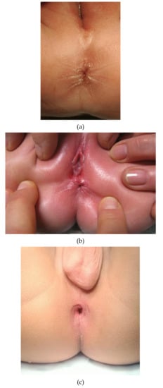 - Reisner, S.H.; Sivan, Y.; Nitzan, M.; Merlob, P. Determination of anterior displacement of the anus in newborn infants and children. Pediatrics 1984, 73, 216–217. [Google Scholar] [CrossRef]