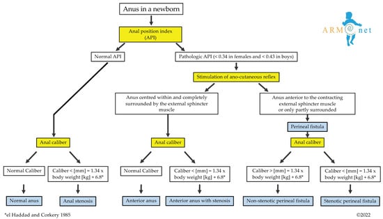 The calibration of the anus is important to determine the diameter of a PF and rule out CAS. PF has, in most cases, a pathologically small anal caliber. CAS has normal API, complete sphincter encircling, and a diameter smaller than the expected caliber related to the patient’s body weight [21]. CAS is a much rarer form of ARM than PF but presents with similar clinical signs and functional prognosis [51,52].