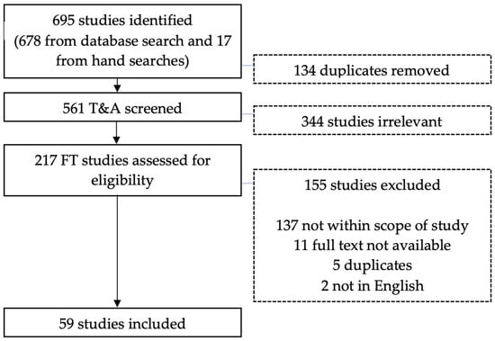 The study selection flowchart is presented in Figure 1. A total of 695 references were identified for screening. Following the removal of duplicates, 561 studies were screened by title and abstract, and subsequently, 217 full-text papers were screened for eligibility. A total of 59 studies met the inclusion criteria and were included for data extraction. The 59 studies took place in the following locations: U.S (n = 32), India (n = 16), Germany (n = 2), UK (n = 2), New Zealand (n = 2), Israel (n = 1), Canada (n = 1), Columbia (n = 1), Sri Lanka (n = 1) and Tunisia (n = 1). Only 10% (n = 6) of studies were conducted before 2010, presenting a substantial and recent increase in the number of related studies. A total of 41% of studies (n = 24) were conducted in the last 5 years.