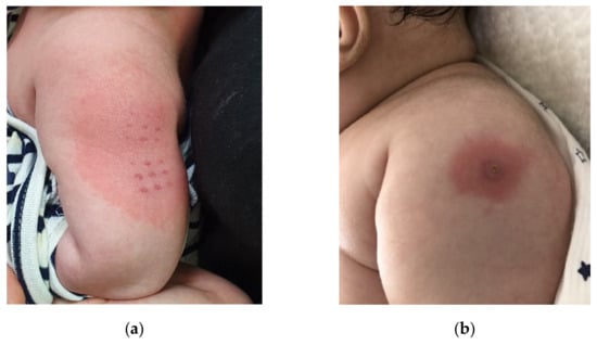 Patients with fever for more than five days and at least four of the five principal criteria (i.e., lip redness, strawberry tongue, bilateral conjunctival injection, cervical lymphadenopathy, changes in extremities, such as erythema and edema of the palms and soles, and rash, including redness at the BCG inoculation site) were diagnosed with complete Kawasaki disease []. Incomplete Kawasaki disease was diagnosed when patients showed less than four of the principal criteria. If BCGitis appeared in a febrile patient whose cause of fever was not clear, Kawasaki disease was considered as a possible diagnosis, even if other symptoms were lacking. In South Korea, BCG vaccination is administered through the transdermal or intradermal route, and the manifestations of BCGitis may differ depending on the route of vaccination (Figure 1). Refractory Kawasaki disease is diagnosed when fever is present for at least 36 h after the end of initial treatment with intravenous immunoglobulin (IVIG).