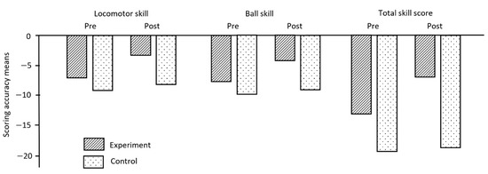 For the subtest of ball skills, there was a significant improvement in the scoring accuracy for the two-hand strike, dribble, and kick skills due to the rater training intervention. The kick skill on the TGMD-2 had the lowest difference between the expert and novice raters for object control (i.e., ball skills on the TGMD-3) skills (Palmer and Brian, 2017) [46]. Additionally, Maeng et al. (2017) [48] concluded that the kick skill on the TGMD-3 had the lowest inter-rater reliability among the ball skills (ICC: 0.51). Moreover, Kim and colleagues (2012) [24] asserted that this skill had a large error variance (18.00%) by rater effects and a low agreement (ICC: 0.50). However, the present study showed that the one-hand strike skill (experiment M = −1.76; control M = −2.30) had the highest-scoring difference compared to the experts. Moreover, the two-hand strike skill showed the second highest-scoring difference (experiment M = −1.70; control M = −2.01). It could be inferred that the performance criteria of the skills on the TGMD-3 among children with DD should be examined to identify the error variances by raters according to their characteristics in future research. In other words, reliability and validity examinations of the TGMD-3 among children with DD should be considered in future studies.