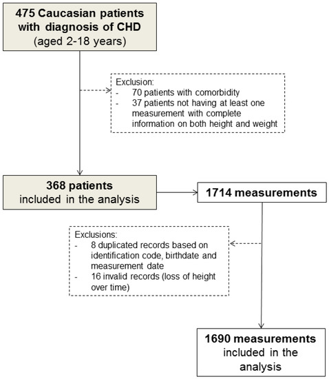 Of the 475 Caucasian children (aged 2–18 years) diagnosed with CHD, 107 who had comorbidities that could affect their growth and development (Table S1 in Supplementary Materials) or who had only one measurement information on either weight or height were excluded from the study (Figure 1).