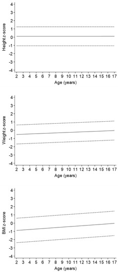 The anthropometric indices measured included height (m), weight (kg), and body mass index (BMI, kg/m2). Weight, height, and BMI were converted into age- and sex-based z-scores based on the lambda, mu, sigma (LMS) method using the following formula: Z = ((X/M)L − 1)/(L*S). LMS values were obtained from the Cacciari standards for the central-northern Italian population [12].