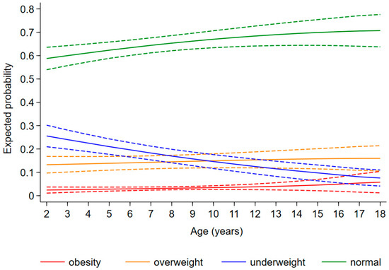 Figure 3. Change in expected probability of underweight (blue), normal weight (green), overweight (orange), and obesity (red) children with age.
