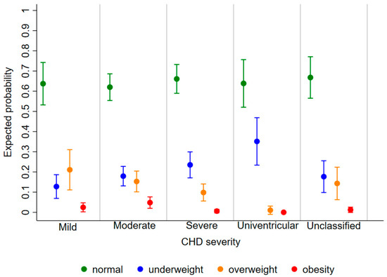 Figure 4. Expected probability of underweight (blue), normal weight (green), overweight (orange), and obesity (red) according to CHD severity.