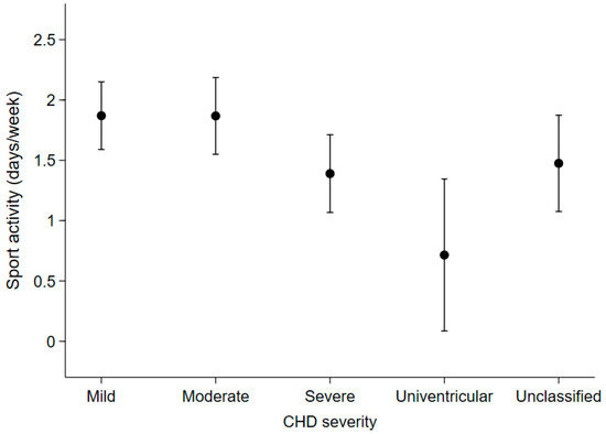 Among the 266 patients who were reachable by phone (72.3% of the total), patients with moderate or severe CHD had an expected number of days spent in sports activities (mean [95%CI]: 1.9 [1.5, 2.2] days/week and 1.4 [1.1, 1.7], respectively), that was not statistically different from those with mild CHD (1.9 [1.6, 2.2]). On the other hand, patients with univentricular heart defects reported spending fewer days in sports activities (0.7 [0.1, 1.3]) than patients with mild or moderate CHD (Figure 5).