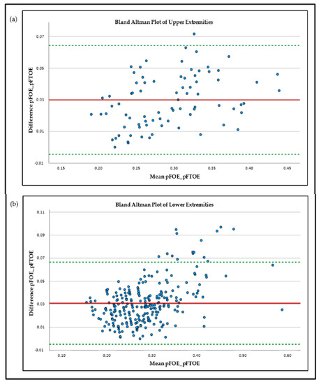 The results for the measured mean values were pTOI 69% ± 6% for UE and 70% ± 6% for LE and pSvO2 66% ± 6% for UE and 67% ± 7% for LE. Comparing the mean values of pFOE and pFTOE, there were significant differences between these two parameters for both locations, UE and LE. UE: pFOE 0.31 ± 0.06 vs. pFTOE 0.28 ± 0.06; p < 0.001; LE: pFOE 0.30 ± 0.07 vs. pFTOE 0.27 ± 0.06; p < 0.001. In both locations, mean pFOE values were higher, compared to pFTOE values. Graphical visualization of the two parameters of the upper and lower extremities using Bland–Altman plots also showed limited comparability (Figure 1) for both upper and lower extremities measurements. Furthermore, with increasing oxygen extraction, the mismatch between pFOE and pFTOE became more apparent, with pFOE having higher values compared to pFTOE.