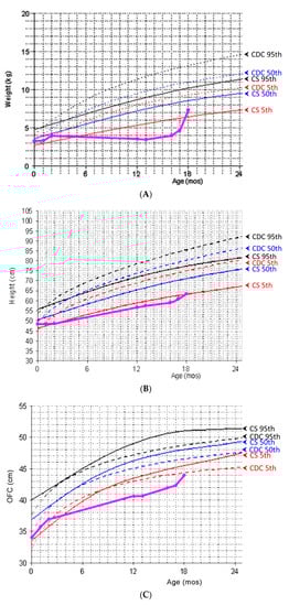 Feeding difficulties, poor suction power, severe GER, and failure to thrive are almost universal clinical manifestations of CS, and alternative feeding methodshave been suggested []. For example, ina small cohort of 20 infants with CS, 95% received NG tube placement, and 35% required gastrostomy tube (G-tube) placement. Treatment with proton pump inhibitors and prokinetic agents should be considered for gastroenterological disorders. The degree of failure to thrive is most severe at 12 months of age, and the body weight of most children with CS at that time period is below the 5th percentile compared to the general population []. The mean weight at one year of age has been reported to be 6.7 kg []. The reasons for failure to thrive are likely multifactorial, and may involve feeding difficulties, poor nutritional intake, hormonal abnormalities, increased resting energy expenditure, and dysregulated central control of body weight via leptin signaling in the hypothalamus [,]. Several studies have reported that CS patients follow a natural growth history in weight and height regardless of whether a normal or hypercaloric diet is given [,]. In addition, it has also beenreported that poor nutritional status may obscurethe classic facial gestalt of CS (downslanting eyes, low nasal bridge, full cheeks, thick lips, etc.) and cause difficulties in making a diagnosis [].