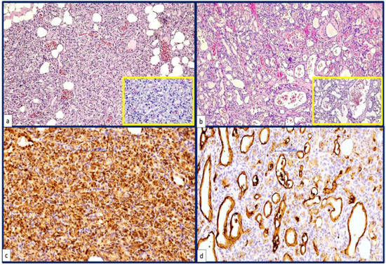 Histopathologic evaluation of two infantile hemangiomas confirmed that one case had microscopic features of a proliferating hemangioma (Figure 2a) and the other was an involuting hemangioma (Figure 2b). Both were positive for GLUT1 (Figure 2c,d).