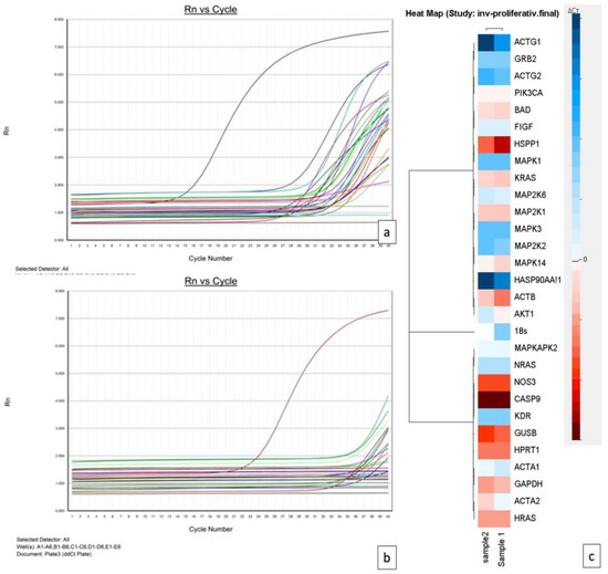 TaqMan analysis of the VEGF pathway gene expression profile revealed a heterogeneity of gene expression between involuting and proliferating hemangiomas. Twenty-six genes of the VEGF pathway were considered in the present study. VEGF-A and VEGF-C genes were upregulated for both types of hemangiomas. The ddCt comparative assessment of the VEGF pathway gene expression profile in proliferative hemangiomas and involuting hemangiomas is shown using amplification plots (raw data) presented in Figure 3a,b. Based on analysis of VEGF gene expression profile parameters, a heatmap was automatically generated using Data Assist software. (Figure 3c).