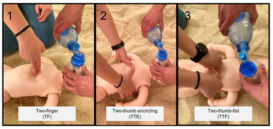 - Rodriguez-Ruiz, E.; Martínez-Puga, A.; Carballo-Fazanes, A.; Abelairas-Gómez, C.; Rodríguez-Nuñez, A. Two new chest compression methods might challenge the standard in a simulated infant model. Eur. J. Pediatr. 2019, 178, 1529–1535. [Google Scholar] [CrossRef]