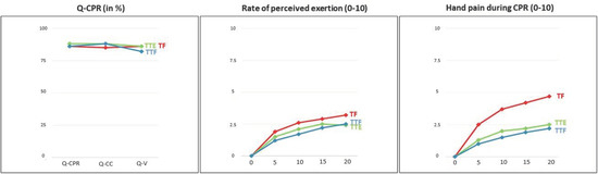 The results of the CPR tests are shown in Table 1. All techniques obtained high Q-CPR values (TF: 86 ± 9%, TTE: 88 ± 9%/TTF: 86 ± 16%). TTE was statistically superior to TF (TTE vs. TF; p = 0.03) although the 2% improvement is not of particular clinical relevance. No differences were found between the techniques in the quality of chest compressions or in the quality of ventilations, with values above 80% in all cases. The quantitative variables of number of CC and number of V were similar, without any statistical significance.