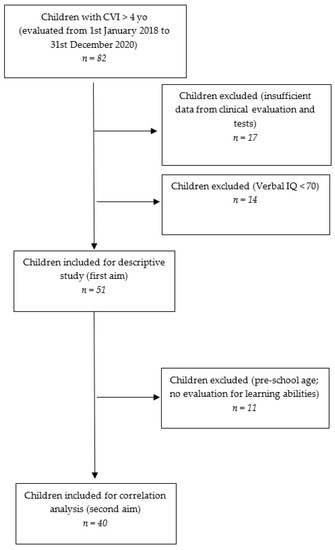 We conducted a retrospective analysis on a cohort of pediatric patients referred to the Developmental Neuro-ophthalmology Unit of a tertiary referral hospital for neurological conditions (IRCCS Mondino Foundation, Pavia, Italy) from 1 January 2018 to 31 December 2020. CVI diagnosis was based on the definition reported in the Introduction [1]. As a clinical diagnosis, it relies on observations of children’s behavior (e.g., the pattern of peri-personal space exploration) and standardized evaluations of visual and visual cognitive functions, together with the support of diagnostic exams to exclude significant ocular involvement. For the diagnostic approach, we referred to previous works on the topic [2,20]. Medical history and diagnostic exams such as brain Magnetic Resonance Imaging (MRI) and Visual Evoked Potentials (VEP) suggesting CNS abnormalities further supported the diagnosis. Data concerning clinical details, neuro-ophthalmological evaluations, and neuropsychological test batteries of 82 children affected by CVI from different etiologies and aged above 4 years old (an adequate age to perform a more comprehensive neuropsychological and visuo-cognitive evaluation) were retrospectively collected. All the evaluations were chosen based on the ages and clinical pictures and performed for clinical purposes by a multidisciplinary team of professionals including child neuropsychiatrists, ophthalmologists, psychomotor therapists, and neuropsychologists with expertise in the field. Inclusion criteria were (1) a diagnosis of CVI; (2) a normal verbal IQ (>70) on Wechsler scales as considered in previous studies on similar topics [25]. Exclusion criteria were established as follows: (1) missing data for most of the clinical evaluations and tests (17 children), (2) Verbal IQ < 70 on Wechsler scales (14 children), (3) presence of a peripheral VI (i.e., caused by such conditions as retinopathy of prematurity or retinal dystrophy, which can directly affect visual perception) (no child met this criterion). A total of 31 children met the exclusion criteria, and 51, with a mean age of 113.07 months (range 62–213) ± 35.7, were preliminarily included (Figure 1) for the general cohort description study. Afterwards, a subgroup of 40 patients, homogeneous in terms of age and performed tests (mean age 121 months, range 78–187, ±29.3) was selected to investigate possible correlations between general clinical and visual features and neuropsychological skills. Subjects included for the correlation analyses were all primary or middle school children, to reduce the age range and to provide more homogeneity in cognitive tests (all children performed WISC-IV scales, and the majority of them were tested for learning abilities).
