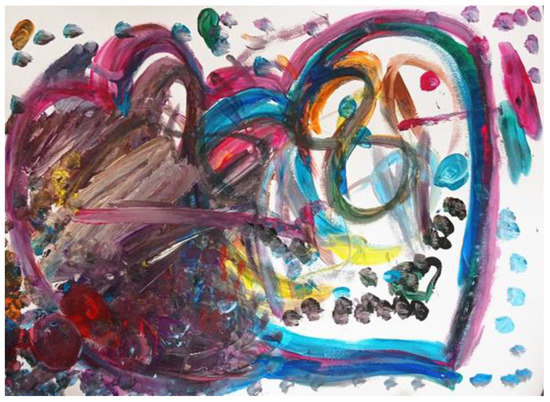 Most of the interaction between Naama and her mother, as expressed in the joined painting, was based on her mother’s attempt to mediate the painting process, encourage her to paint, help her make choices, and support her during painting. Her mother tried to be attentive to Naama and her needs, by upholding and providing her with a space to express herself on her own. The joint painting appeared to have provided Naama with a secure space to express herself and allowed both mother and daughter to experience mutual and shared creative expression (see Figure 2).