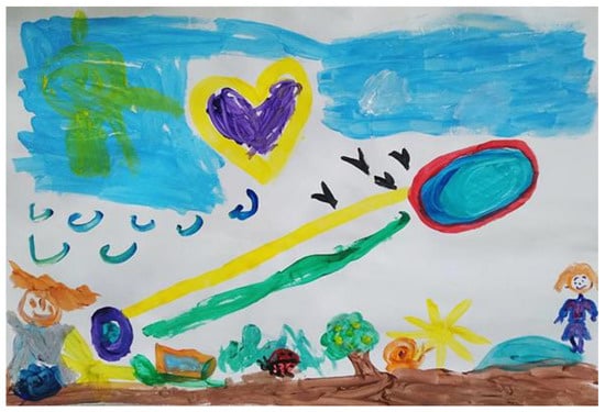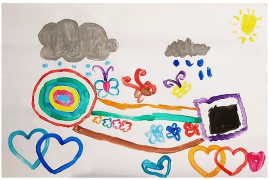 To summarize, during the creative process, the interaction between Meital and her mother shifted from a relaxed atmosphere to anger when Meital reacted to the fact that her mother had never told her what her favorite color was, and about not painting together. At this stage, Meital only painted in black, and later, when her mother painted a colorful frame, Meital responded positively and used other colors (see Figure 4). At this point the mood changed, and there was laughter in the room and both of their paintings became more colorful. This atmosphere continued during the joint painting stage, when the conversation between Meital and mother was respectful and mutual. This type of communication was also portrayed in the artwork that included pairs of similar figures such as the sun, butterflies, and hearts.