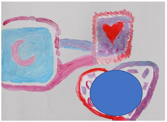 When asked to draw a border around their paintings, Rona’s mother again drew Rona’s attention to the big heart frame in turquoise. She asked Rona: “Where is your heart?” but Rona did not react and refused to draw a border, while continuing to paint on her hand. Her mother painted a pink heart outline for Rona. Rona was excited, took the paintbrush from her mother’s hand, dipped it into her mother’s palette and together they reinforced the border of Rona’s heart in turquoise. When asked to draw a path, Rona’s mother painted a pink line from the inside of her heart to the inside of Rona’s heart and continued to thicken the borders of the hearts in the same color. Rona did not want to paint a path and continued to paint on her hand. In the joint space, her mother painted orange and blue scattered circles and one small heart inside her heart. She tried to paint dots in the style of Rona’s tapping and then tried to hold Rona’s hand and paint with her, but Rona refused and continued painting on her hand.