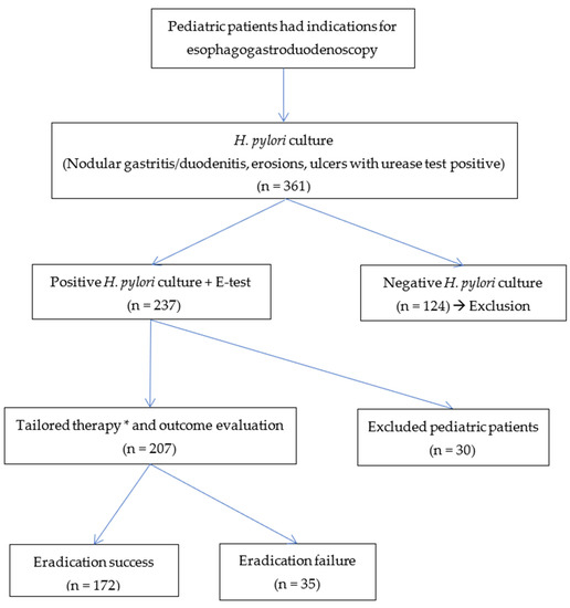 The 14-day regimen was tailored based on the antimicrobial susceptibility test results of the H. pylori strain isolated from gastric biopsies of every patient. This therapy consisted of a PPI (esomeprazole) and two antibiotic agents to which the H. pylori strain was susceptible. Bismuth-based quadruple therapy was used when pediatric patients infected with H. pylori strains were only susceptible to TET or AMX. The dosages of drugs were determined according to the 2017 ESPGHAN/NASPGHAN guidelines [4,10,11].
