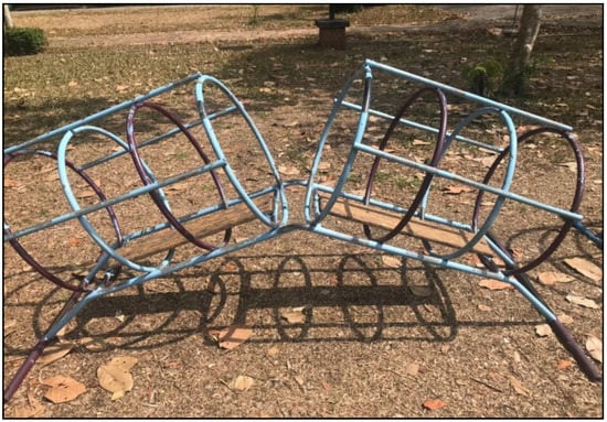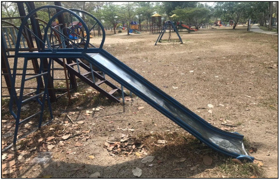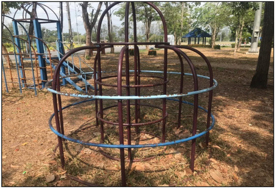 Considering the details of each piece of playground equipment, it was found that most of the playground equipment was damaged in condition, rusty, and lacked continuous maintenance, and thus did not comply with safety standards. The details are shown in Figure 1, Figure 2, Figure 3 and Figure 4.