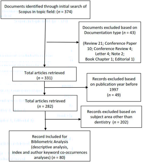 We retrieved 374 documents by entering the search query string of TITLE-ABS-KEY (“digital health interventions in children oral and dental health”) into the Scopus search engine on 10 April 2022. As digital health is a new and emerging concept of technology, we specified the publication year 1996 as the start year of included documents for the Scopus search. Finally, 80 documents were subjected to analysis. The list of included articles is available at Supplementary S1.