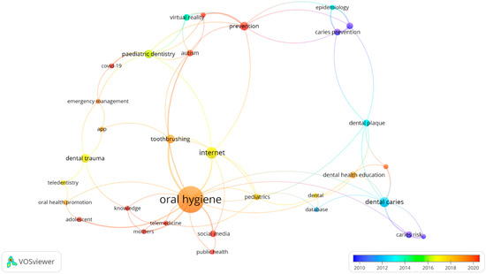 From the novelty aspect of digital technologies in oral and dental health (Figure 4), social media and telemedicine were frequently author keywords used with public health programs, mother’s knowledge, COVID-19, prevention, and autism in 2020. Apps, cell phones, the internet and tele-dentistry were author keywords used more with oral hygiene, dental pediatrics, oral health education and promotion, dental trauma, and tooth brushing during 2015 to 2020 in the publications.