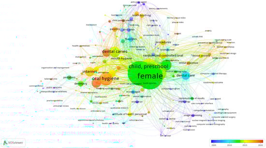 Alternatively, and in contrast with author keywords, the index keyword co-occurrence showed 174 keywords (Figure 6). It can be seen that the dominant index keywords were female, male, preschool child, oral hygiene, dental caries, and Internet. Regarding the frequency of occurrence of keywords, two digital technologies, the Internet and cell phone, had the greatest occurrence among the research topics with 15 and 10, respectively. Furthermore, the most frequent oral and dental-health-related terms were oral hygiene and dental caries, with 21 and 17 occurrences among the literature. From the age group aspect, preschool occurred most frequently in articles. This means that these keywords were the most discussed by researchers in the January 1997–April 2022 period. Furthermore, from the study methodology perspective, two methods (clinical trial/randomized and cross-sectional) have the most occurrences, 27 and 13 times, respectively, among the publications. Based on this result, it seems that the co-occurrence analysis using index keywords produced a clearer understanding of the current state of the topic in comparison to author keywords co-occurrence analysis.