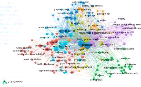 Cluster 2 (in green) shows the variety of digital technology interventions that are associated with children’s oral health. The most notable among them was computer assisted systems, including audio-visual equipment, computer assisted diagnosis, computer assisted surgery, computer assisted therapy, computer assisted tomography, computer program, computer simulation, image processing, user-computer interface, three-dimensional imaging treatment, computer-assisted, and nuclear magnetic resonance imaging. The later variety of digital technologies was accompanied with oral and dental-health-related items or keywords such as cephalometry, dental aesthetics, malocclusion, maxillofacial surgery, and orthodontics. Another relationship among the digital technology interventions observed in this cluster with other index keywords was seen with treatment planning and outcomes, psychological terminology like self-concept and patient satisfaction, and radiography and mothers. This digital applications/intervention cluster was mainly retrieved from the methodological approach of case reports.