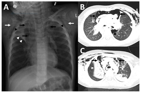 - Dehmel, M.; Demirakca, S.; Jordan, A.; Dahlheim, M.; Diehm, T.; Schroten, H.; Tenenbaum, T. Pneumomediastinum and subcutaneus emphysema—An uncommon presentation of respiratory-syncytial virus infection in an infant. Klin Padiatr. 2013, 225, 230–231. [Google Scholar] [CrossRef]
