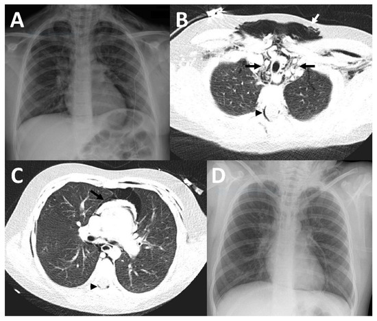 - Emiralioglu, N.; Ozcan, H.N.; Oguz, B.; Yalcin, E.; Dogru, D.; Ozcelik, U.; Kiper, N. Pneumomediastinum, pneumorrhachis and subcutaneous emphysema associated with viral infections: Report of three cases. Pediatr. Int. 2015, 57, 1038–1040. [Google Scholar] [CrossRef]