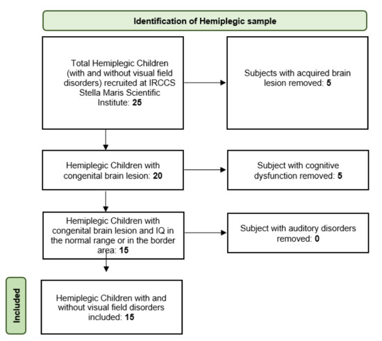 Fifteen hemiplegic children (Mean age 8.9, SD 0.5, 9 females), 5 with left hemiplegia and 10 with right hemiplegia, and 20 children with typical development (Mean age: 9.6, SD 0.3, 10 females) took part in the experiment. The hemiplegic group was split into two subgroups: 9 hemiplegic children without visual field defects and 6 hemiplegic children also presenting a visual deficit (see Table 1 for details). Patient enrollment is well described in the following flowchart below (Figure 1)