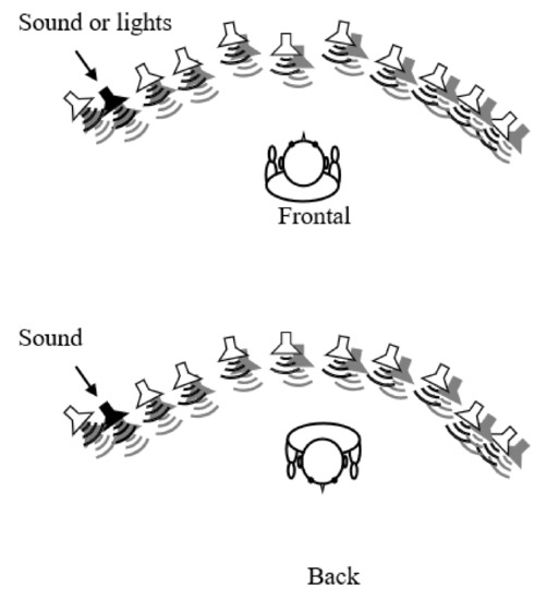 Participants were seated in the center of an array of 11 loudspeakers and red LEDs positioned in an arc on a table. The center of each loudspeaker and LED was positioned at 7 cm from the center of the next. The position of the speaker array was fixed in the approximate center of the room. The seating distance was 45 cm from the middle loudspeaker; the participant’s ears were aligned with the loudspeakers so that sounds were presented at 0° elevation (Figure 2).