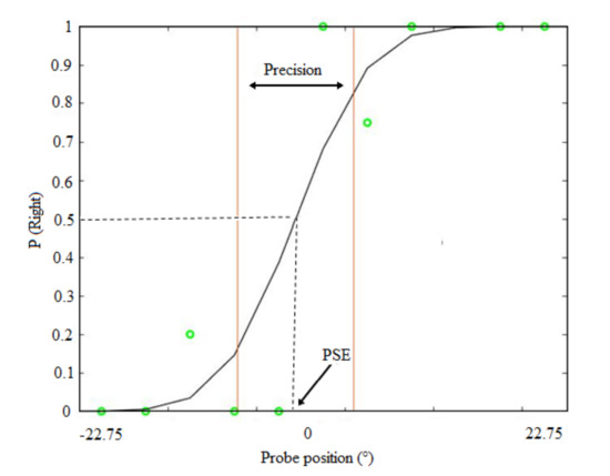 No feedback was given, and the response time was not constrained. Each participant performed 66 trials for the auditory blocks (33 trials for each pitch and each side in a randomized way) and 36 trials for the visual block (18 for each side). Data collection lasted approximately 1 h. For the spatial discrimination task, we calculated the probability that the response to the sound or light was to the right. The data sets were fitted with cumulative Gaussian functions (see Figure 3). Figure 3 shows an example of a psychometric function from a typical participant for the spatial bisection task. The probability that the response to the sound or light was to the right is plotted as a function of sound or light position. For each participant and condition, the standard deviation (σ) of the fit, which provides an estimate of the slope of the psychometric function, was taken as the estimate of threshold/precision (JND). The midpoint of the function is represented by the Point of Subjective Equality (PSE). For the pitch discrimination task, we calculated the proportion of correct responses.