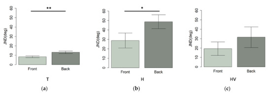 Mean values and standard deviation expressed as JND at auditory spatial discrimination task in (a) front presentation and (b) back presentation in T, H, and HV children. * p-value < 0.05; ** p < 0.01.