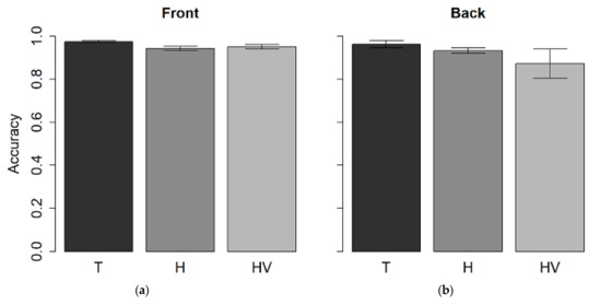 Mean values and standard deviation expressed as accuracy at pitch discrimination task in (a) front presentation and (b) back presentation in T, H, and HV children.