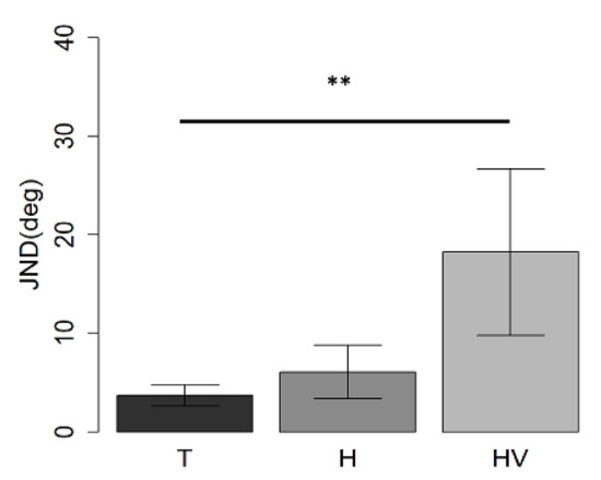 Mean values and standard deviation expressed as JND in the visual-spatial discrimination task in T, H, and HV children. ** indicates a p-value < 0.01.