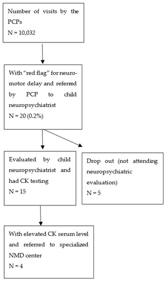 Here, we report on a pilot study aimed at promoting the early diagnosis of NMDs in children within the first two years of life. The study was conducted in a health district of about 300,000 inhabitants in the metropolitan area of Turin (Italy), with the aim of examining the feasibility of a collaborative care three-step screening approach involving, in sequence, primary care pediatricians (PCP), community child neuropsychiatric services, and a hospital-based specialized center in NMDs. In particular, the study was meant to address the following questions: (a) what is the acceptability by PCPs of conducting a brief screening of motor developmental milestones during the routine well-child care visits of the national health systems during the first two years of life? (b) what is the yield of PCP-identified “red flags”? (c) what is the follow-up of the children who screened positive regarding neuropsychiatric visits and CK serum levels?