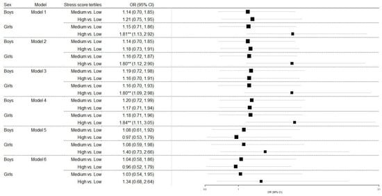 However, residual confounding may exist due to the observational nature of the present study. In Table 4, the results from nested logistic regression models evaluating the association between stress and children’s weight status, after taking into consideration various children’s characteristics, are presented. In total, six models were estimated. As can be drawn from model 1, children with a high stress score were 51.7% more likely to have overweight/obesity compared to children with low-stress score (OR (95% CI): 1.52 (1.09–2.12), p < 0.05). No such association was revealed when comparing children with a moderate stress score to those with a low stress score. This association between stress score and weight status remained significant irrespective of sex, age, physical activity level of children, and KIDMED score (models 2, 3, and 4). However, when the parental educational level was taken into account (model 5), it was observed that stress score was not associated with children’s weight status, irrespective of all other factors included in model 5. This was also the case when the family structure and the place of residence were included in the final model (model 6). The association between stress and children’s weight status by sex is presented in Figure 1. A positive association was found only in girls (models 1 to 4).