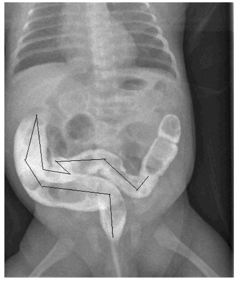 - Lee, B.; Wu, A. Pediatric Sigmoid Volvulus. Pediatr. Emerg. Care 2019, 35, e232–e233. [Google Scholar] [CrossRef] [PubMed]