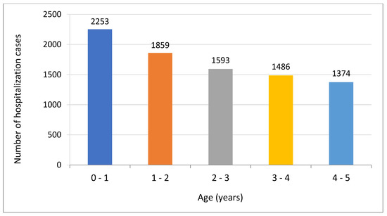 As reported in Figure 3, most of the cases were observed in children under 1 year of age. At this age, we observed 2253 cases (26% of all cases). Additionally, the hospitalization rate at the level of 16% of all hospitalizations occurred in the <6-month-age-group.