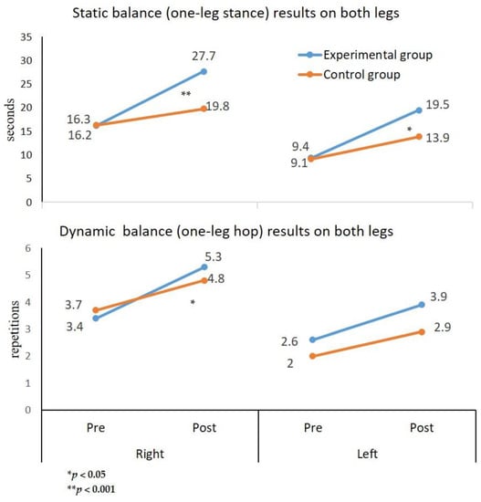 Additionally, participants in the experimental group significantly improved their one-leg stance on the right and left leg by 71% and 108%, respectively (p < 0.05), while participants in the control group tended to improve their one-leg stance on the right and left leg by only 22% and 53%, respectively.