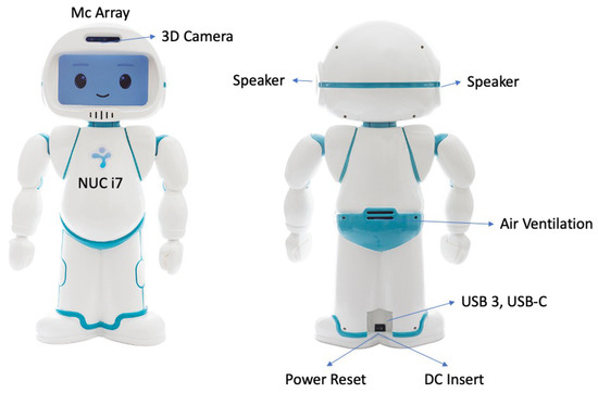 QTrobot is an expressive little humanoid robot (dimensions: 574 × 311 × 275 mm; weight: 5 Kg), designed and built to assist therapists in teaching new skills (cognitive, social, communication, and emotional) to children with autism or special educational needs (Figure 3). This robot is characterized by high motricity in the neck and hands (DOF: 12). This is equipped with: (a) a face display that can show movies, thus emulating basic emotional expressions; (b) a 3D intel RealSense camera that enables vision and gesture recognition in space, as well as excellent resolution for facial recognition; and (c) microphones to recognize where the sound is coming from and speakers which allow the robot to produce verbal communication or play sounds.