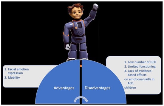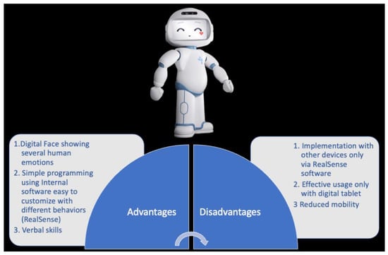 The most significant disadvantages are that it has few sensory features and effective usage only with digital tablets (Figure 4). Generally, robots employed in RAT should be able to detect the child’s position in order to orient the child in performing specific actions and responses [27]. QTrobot is only equipped with RealSense which does not allow this kind of interactive spatial evaluation. Moreover, the child–robot interaction is mediated by the use of a digital tablet that could create an overstimulation for the child. Another pitfall is the lack of applications in clinical trials. Nowadays, only two studies evaluated the effectiveness of QTrobot in reducing repetitive and stereotyped behaviors and in increasing joint attention and emotional skills in children with ASD [22,23].
