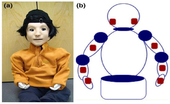 KASPAR robot (a) and sensors localization (b).