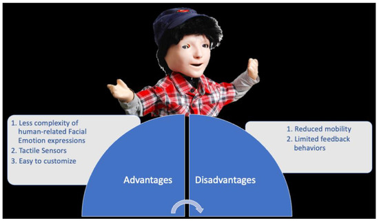 The most significant advantages of this device are: (a) less complexity of human-related facial emotion expressions; (b) tactile sensors, and (c) it is easy to customize to autism needs (Figure 6). Kaspar has a realistic face with a less complex actuation system [29], i.e., KASPAR can open and close its mouth, can smile and frown, can move its eyes up/down and left/right, and finally, it can open/close the eyelids. This system reduces the complexity of social stimulus; consequently, KASPAR can be more predictable, less distracting, trustable, and less ambiguous than a human person would be [30]. Differently from other robots, KASPAR is equipped with tactile sensors; this means that children can observe the effect of pressing buttons on Kaspar’s motion, so they can benefit from a turn-taking interaction, given that children with ASD usually tend to not engage in such behavior [16].